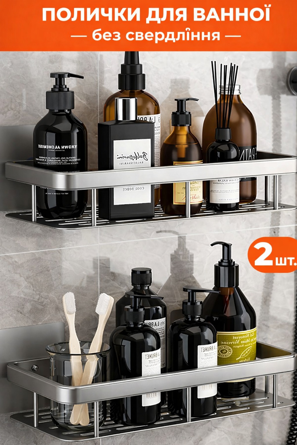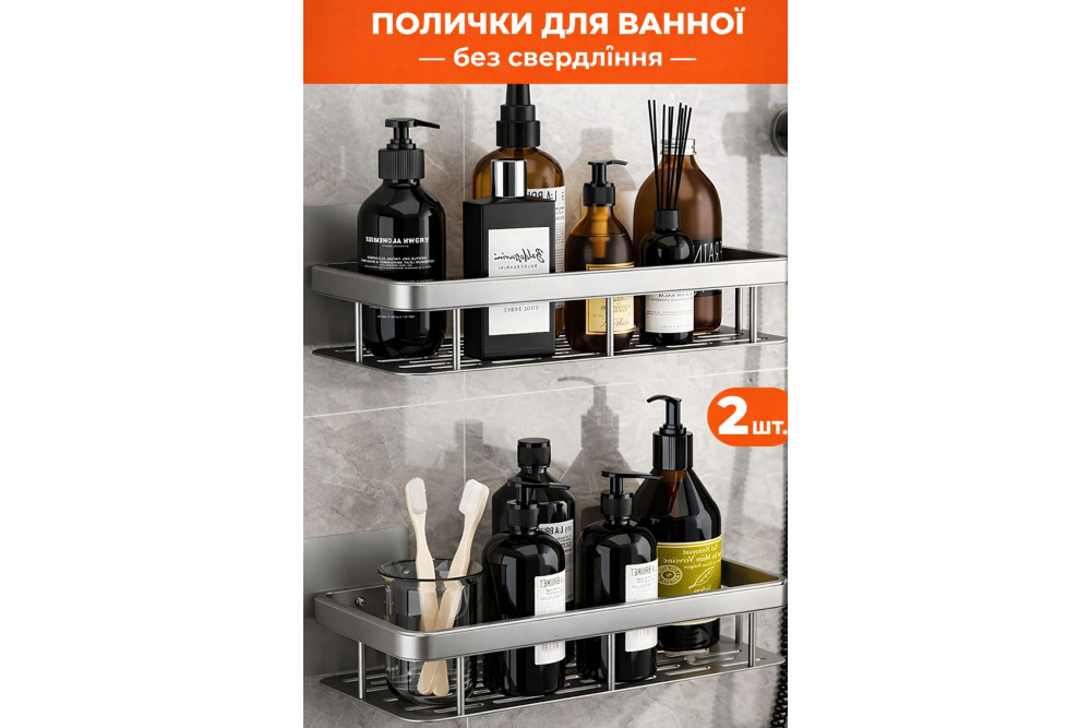 Настенная полка - органайзер Bathroom shelf 2шт. для ванной комнаты душевой кабины, кухни, на самоклеющейся пленке, с защитой от коррозии 30х13х5.5см серебристый