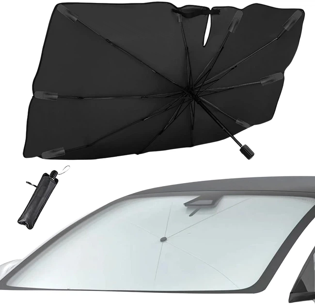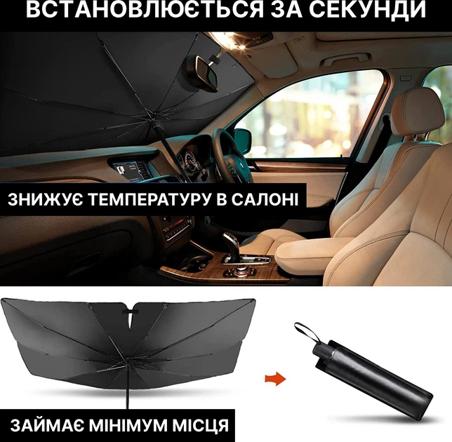 Солнцезащитный шторка-зонтик на лобовое стекло авто с чехлом 135x75см черная