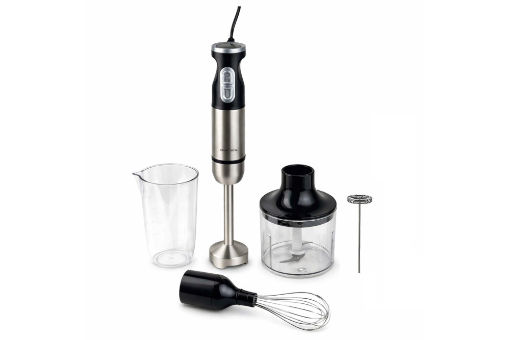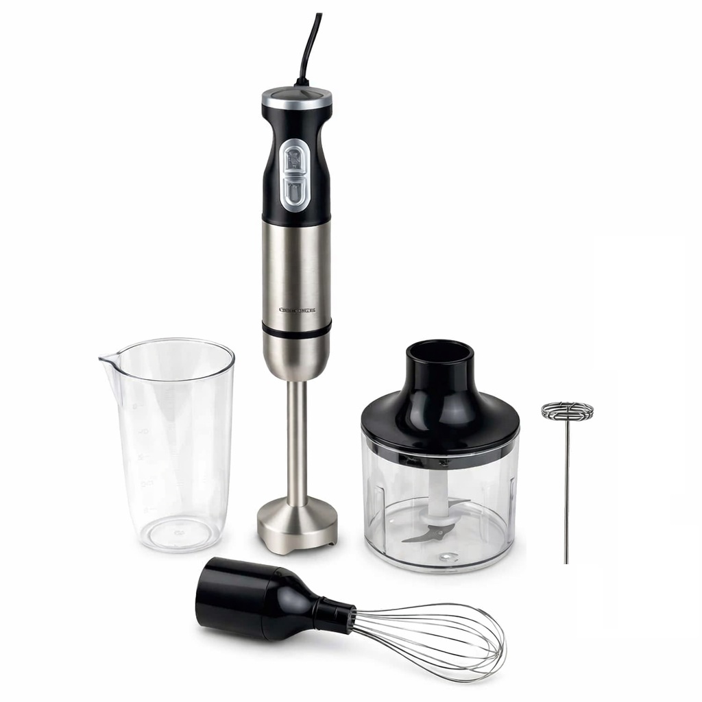 Данный набор включает в себя блендер и насадки для различных кулинарных задач, включая смешивание, измельчение и взбивание.