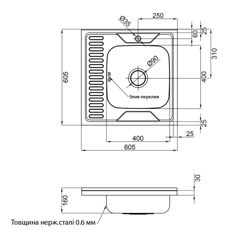 Кухонная мойка KRONER (KRP) Dekor-6060R D0.6T160