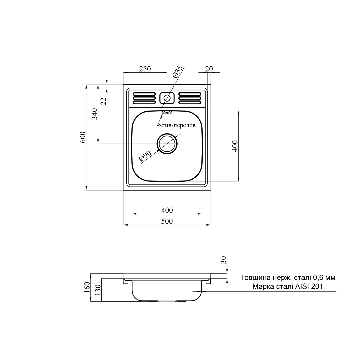 Диаметр слива составляет 90 мм, что обеспечивает эффективное сливание воды и предотвращает засор. Материал мойки изготовлен из нержавеющей стали SUS201, что обеспечивает прочность и стойкость к коррозии, делая ее идеальным выбором для кухонной среды.