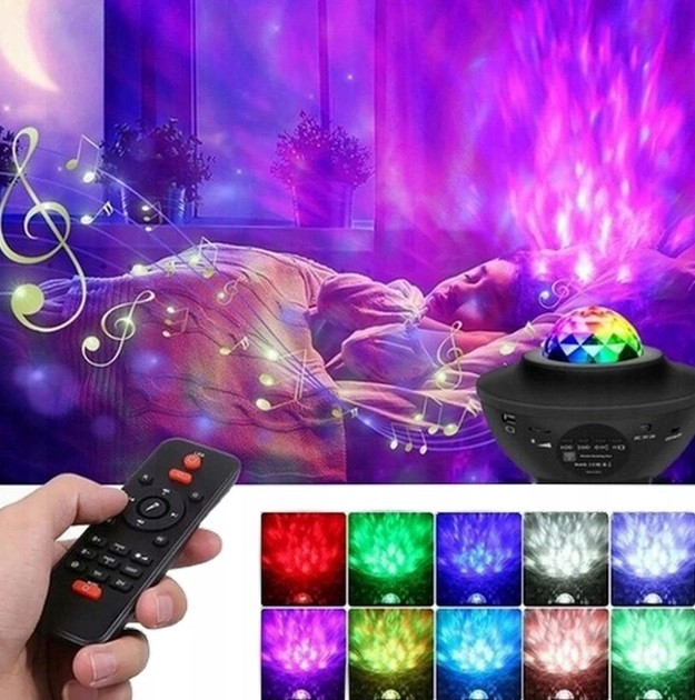 1) Проектор зоряного неба ідеальний у ролі диско-кулі під час сімейної чи романтичної вечері вдома з коханими та друзями. Так само корисний у дитячій кімнаті, як дитячий проектор, допоможе Вам заспокоїти і приспати малюка, поставивши яскравість світлодіодів на мінімальну потужність і включивши казку через Bluetooth або USB, вбудовану в сам зірковий нічник. Світлодіодний проектор чудово доповнюється RGB підсвічуванням, неоновою або LED стрічкою, а також кільцевою лампою. Різні режими відображення проекції. Всі функції зоряного нічника працюють незалежно одна від одної, можна вмикати або відключати зелений лазер (який імітує зірки) окремо при різних рівнях LED підсвічування, як і рух хвиль. Живлення як від розетки, так і power банку.