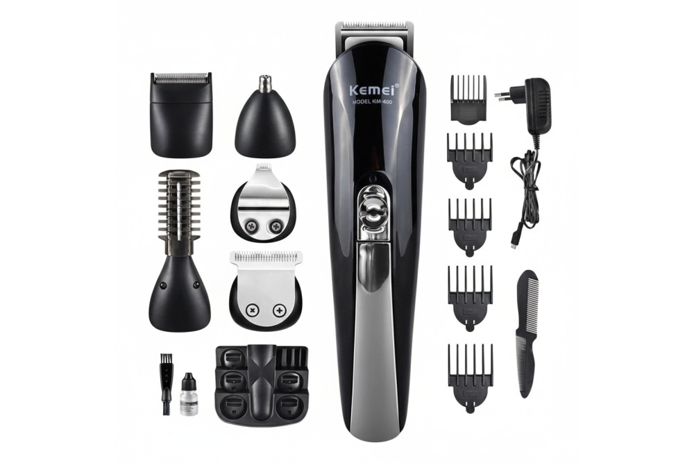 Набір для стрижки волосся Kemei, є універсальною машинкою для стрижки з 11 насадками. Дві насадки для стрижки різної ширини, насадки регулювання довжини 3-12 мм, триммер для носа, дизайнерський триммер, вузький триммер, сіткова бритва, насадка 3-4,5 мм.