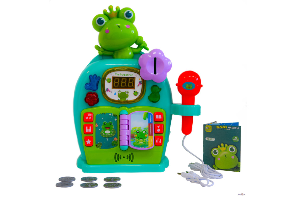 Захоплююча інтерактивна іграшка "Караоке машина". Пропонує безліч функцій: 21 пісня, музика, казки, яскраве підсвічування та можливість співати через мікрофон. Щоб караоке машина почала працювати – киньте в неї монетку. Потім виберіть мелодію, або казку. Коли пісня закінчиться, табло покаже кількість балів, яку ви набрали під час виконання пісні.