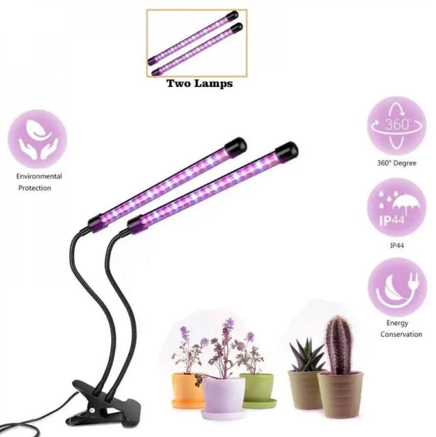 Фітолампа світлодіодна LED Plant Grow Light на 2 лампи для росту рослин на прищіпці фітосвітильник для кімнатних квітів, розсади