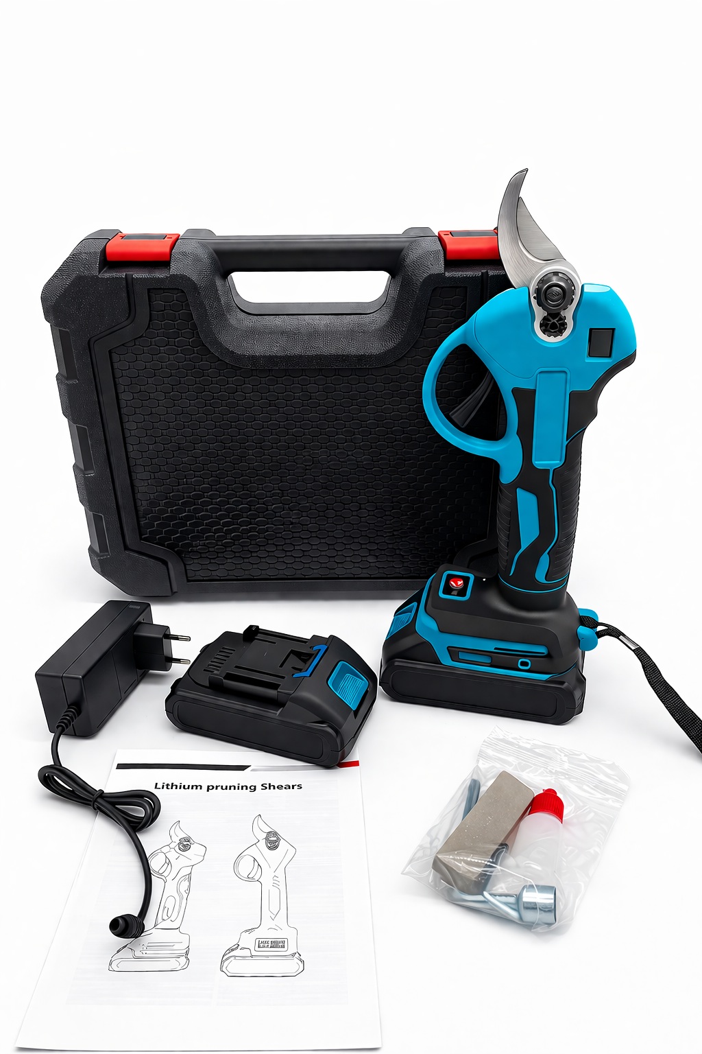 Секатор акумуляторний садовий 21V 2 АКБ електричний портативний електросекатор, садові ножиці в кейсі чорно-синій